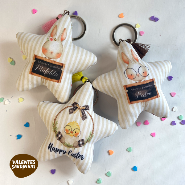 Nas estrelinhas dos coelhos, a mensagem padrão do quadro é Adoro-te e o nome da/o Madrinha/Padrinho e no verso o nome da criança. Nas estrelinhas do pintainho à frente diz Feliz Páscoa e no verso o nome da pessoa a quem vá oferecer.