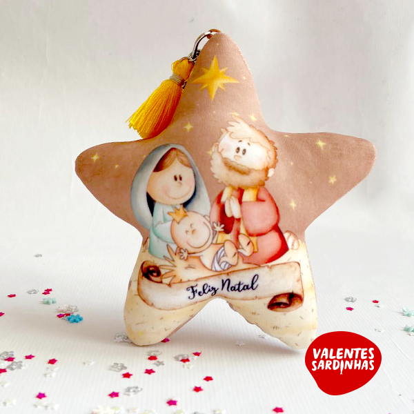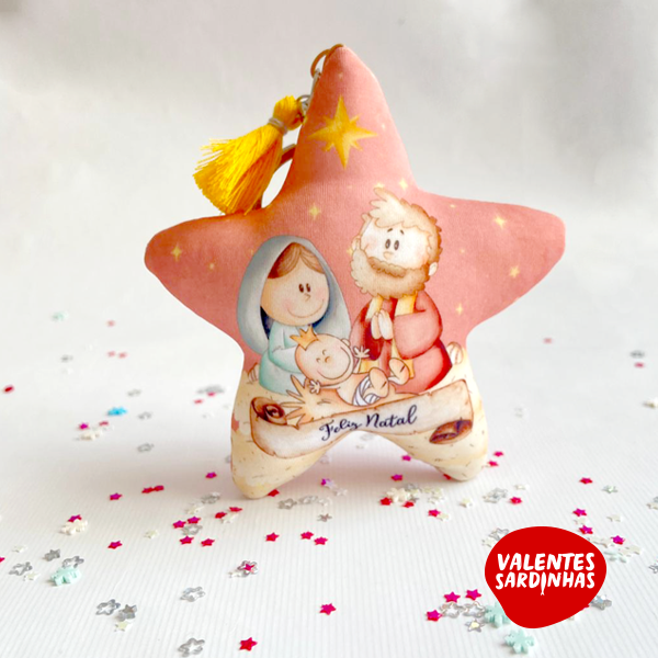 Estrelinhas porta-chaves ou enfeite de árvore ilustradas com a "Sagrada Família" onde no verso pode optar por desejar algo a alguém como: Amor, Paz, Felecidade, Saúde, sucesso ...
