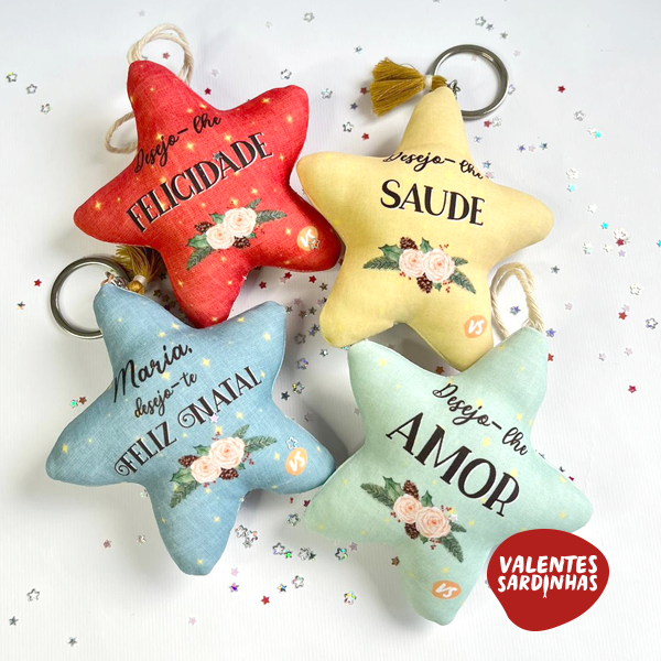 Estrelinhas porta-chaves ou enfeite de árvore ilustradas com a "Sagrada Família" onde no verso deseja algo a alguém como: Amor, Paz, Felecidade, Saúde, sucesso ...