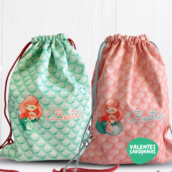 - O saco pode ser feito com ou sem bolso, se escolher sem bolso o saco fica igual ao que aparece na imagem, se quiser bolso, o nome e a sereia fica no bolso do saco.